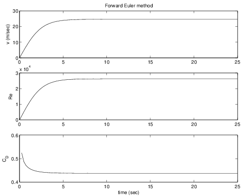 Now, let's apply the forward Euler method to solving the falling sphere problem. Suppose the sphere is actually a small particle of ice falling in the atmosphere at an altitude of approximately 3000 meters. Specifically, let's assume the radius of the particle is \(a = 0.01 m\). Then, since the density of ice is approximately \(\rho _ p = 917 \, kg/m^3\), the mass of the particle can be calculated from,