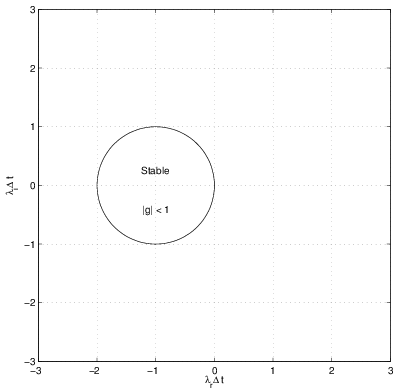 which is the amplification factor for the forward Euler method. Now, we must determine what values of \(\lambda {\Delta t}\) lead to instability (or stability). A simple way to do this for multi-step methods is to solve for the stability boundary for which \(|g| = 1\). To do this, let \(g = e^{i\theta }\) (since \(|e^{i\theta }| = 1\)) where \(\theta = [0,2\pi ]\). Making this substitution into the amplification factor,