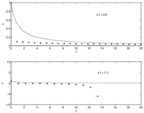 Let's return to the previous example, \(u_ t = -u^2\) with \(u(0) = 1\). To determine the timestep restrictions, we must estimate the eigenvalue for this problem. Linearizing this problem about a known state gives the eigenvalue as \(\lambda = {\partial f}/{\partial u} = -2u\). Since the solution will decay from the initial condition (since \(u_ t < 0\) because \(-u^2 < 0\)), the largest magnitude of the eigenvalue occurs at the initial condition when \(u(0) = 1\) and thus, \(\lambda = -2\). Since this eigenvalue is a negative real number, the maximum \({\Delta t}\) will occur at the maximum extent of the stability region along the negative real axis. Since this occurs when \(\lambda {\Delta t}= -2\), this implies that \({\Delta t}< 1\). To test the validity of this analysis, the forward Euler method was run for \({\Delta t}= 0.9\) and \({\Delta t}= 1.1\). The results are shown in Figure 1.11 which are stable for \({\Delta t}= 0.9\) but are unstable for \({\Delta t}= 1.1\).