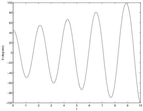 Thus, we see that the eigenvalues will always be imaginary for this problem. As a result, since the forward Euler stability region does not contain any part of the imaginary axis (except the origin), no finite timestep exists which will be stable. This explains why the amplitude increases for the pendulum simulations in Figure 1.8.