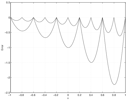 The MATLAB® implementation of the finite element method for the problem described in Section 2.8.1 is shown below. Note, at the bottom of the script the exact solution and the error in the finite element solution are calculated and plotted. Interestingly, the FEM results for linear elements are exact at the nodes. This in general is not true, and is only a result of this specific problem. However, in between the nodes (i.e., within the elements), there is error since a linear function is being used to represent a higher-order (curved) solution. The error, \(\tilde{T}(x)-T(x)\), is shown in Figure 2.40 for both \(N=5\) and \(N=10\) solutions. Note: to construct this plot, each element was subdivided into 20 points and the FEM and exact solution were calculated at these points and compared.