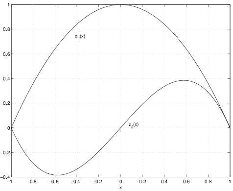 First, we note that requiring \(\phi _ j(\pm 1) = 0\) places two conditions on each \(\phi _ j(x)\). These two conditions can be satisfied with a linear function of \(x\), but the linear function which equals 0 at \(x = \pm 1\) is simply \(0\). Since this does not add anything to the solution even after multiplying by a weight, the first non-trivial function would be a quadratic function.