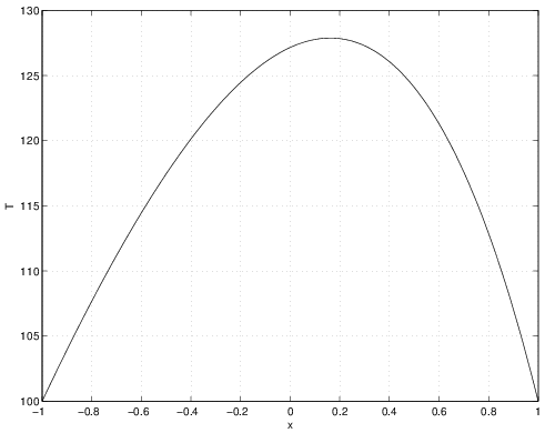 where \(\tilde{T}(x)\) is the approximation of \(T(x)\), \(N\) is the number of terms (functions) in the approximation, \(\phi _ j(x)\) are the (known) functions, and \(a_ j\) are the unknown function weights. The functions \(\phi _ j(x)\) are often called basis functions. They are usually designed to satisfy the boundary conditions. So, in this example where the temperature is 100 at \(x = \pm 1\), then \(\phi _ j(\pm 1) = 0\) (don't forget that \(\tilde{T}\) was defined to include the constant term of 100).