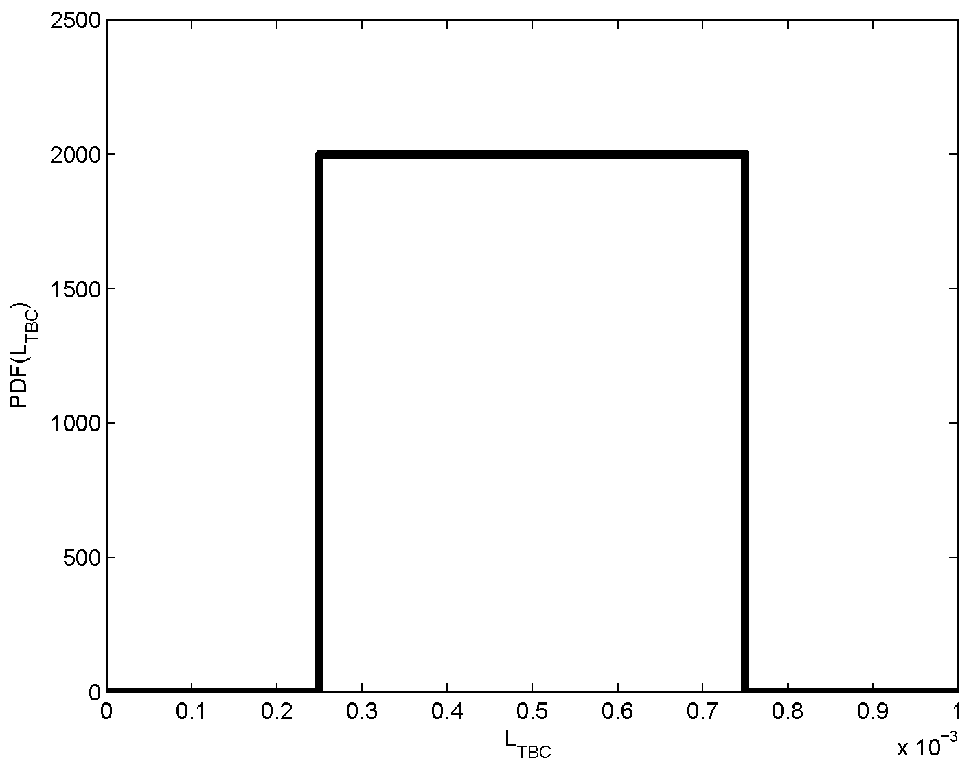 To demonstrate the Monte Carlo simulation method in more detail, let's consider the specific case where the thermal barrier coating in the previous turbine blade example is known to be uniformly distributed from \(0.00025m < L_{TBC} < 0.00075m\) as shown from the probability density function (PDF) of LTBC in Figure 3.3.