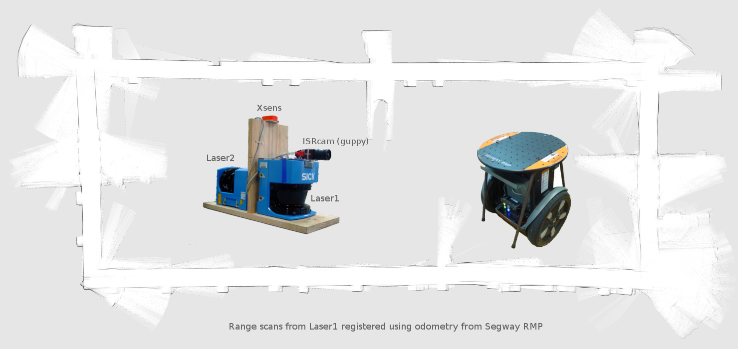 Carmen log files for indoor environment (approx 80x30 m), of sequences of multi-sensor data. Overlapping sequences of environment were scanned to demonstrate the difficulty of registering data using odometry and to test loop-closing ability of map-building algorithms. Sensor data includes range scans from horizontal SICK LMS 200 (RAWLASER1), vertical SICK LMS 200(RAWLASER2), Xsens MTI 400 IMU (XSENS) , Guppy camera (ISRCAM) and Segway RMP 200 pose data (ODOM & SEGPOS) Images and thumbnail created using CARMEN module 'Vasco' (included [Vasco]corrected odometry data in the data log-file)