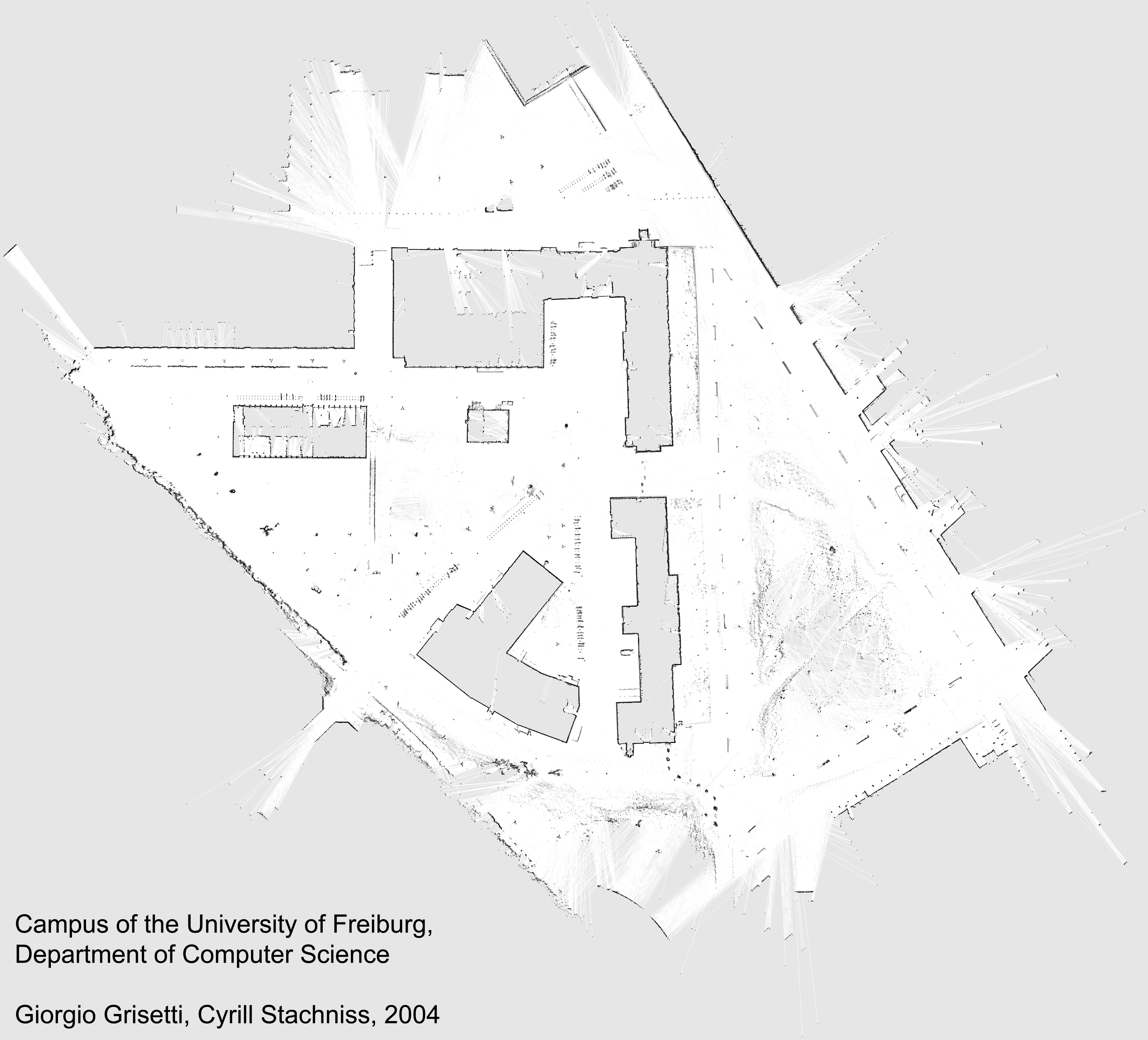 log-file: fr-campus-20040714.carmen.log format : raw robot data file in the carmen logger format (ODOM, FLASER, PARAM) robot : Pioneer2AT (herbert) with one SICK LMS291-S05 (FLASER) date : 14 July 2004 place : campus of the Department of Computer Science, Univ of Freiburg size : approx. 250m x 250m, robot traveled 1.750km (~ 1.088 miles) creators: Cyrill Stachniss & Giorgio Grisetti map(s) : carmen-map-files: fr_campus_100p_10cm.cmf - 100 particles, 10cm grid resolution fr_campus_100p_30cm.cmf - 100 particles, 30cm grid resolution fr_campus_30p_10cm.cmf - 30 particles, 10cm grid resolution fr_campus_30p_30cm.cmf - 30 particles, 30cm grid resolution image-files: fr_campus_100p_10cm.png fr_campus_100p_30cm.png fr_campus_100p_30cm_path.png (including the path of the robot) fr_campus_30p_10cm.png fr_campus_30p_30cm.png The maps have been created with Giorgio Grisetti's great Rao-Blackwellized mapper. For more information see: Cyrill Stachniss, Giorgio Grisetti, Dirk Haehnel, and Wolfram Burgard. "Improved Rao-Blackwellized Mapping by Adaptive Techniques and Active Loop-Closure" (SOAVE04, SelfOrganization of AdaptiVE behavior 04). We generated the maps with two different particle sets. The first map was computed with 100 particles which produces really nice results. Due to Giorgio's optimization he is able to build the map with only 30(!) particles and the result is nearly as good as the one 100 particles. comments: This is an outdoor data-set with some moving objects (cars people, bikes), with some trees, bushes, a lot of free space and of course not 100% plain surfaces....